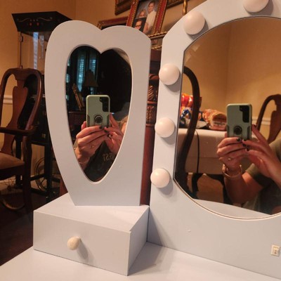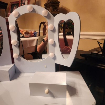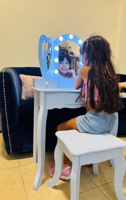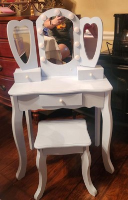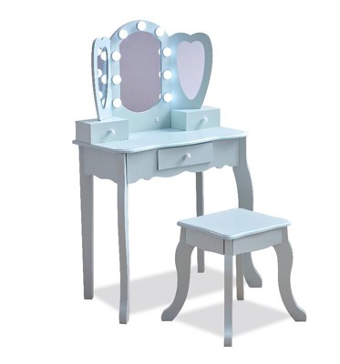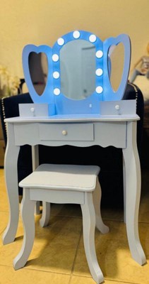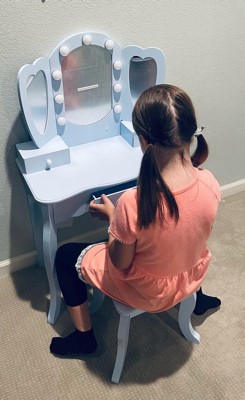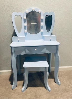 [This review was collected as part of a promotion.] I'm absolutely thrilled with the Teamson Kids Heart Glow Play Vanity Set in Light Blue! My daughter is OBSESSED with it - she loves playing with her "makeup" and doing her "beauty routine" in front of the triple mirror with LED lights. The heart-shaped vanity is super cute and looks like it's made of really good quality material. It's not only adorable but also seems sturdy enough for daily play. Easy to assemble. The matching stool is perfect for her to sit comfortably while she gets ready. Overall, this vanity set is super pretty, encourages creativity and self-care routines, and my daughter can't get enough of it! Definitely a great gift for kids who love playing dress-up and doing their own "glam" routines.