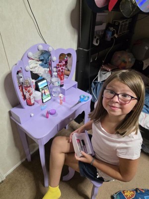 Featuring a triple mirror and built-in LED lights, this vanity provides a clear, bright view for brushing hair, pretending to apply makeup, or getting ready for the day. The included matching stool ensures comfortable seating for extended playtime.
