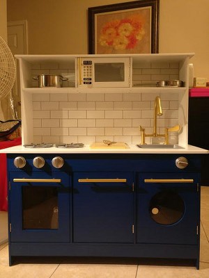 [This review was collected as part of a promotion.] I have been looking for a play kitchen for my kid's because they love to be in the kitchen helping me when I cook and I am so happy that they have their own little kitchen to pretend play. The Teamson Kids - Little Chef Berlin Modern Play Kitchen is adorable and has real like features. It was very easy to assemble and looks stylish, I like that it's made well and should last a long time. The bold blue color goes great with the golden faucet. It has plenty of storage space for all the pots and pans that I bought them and I love the microwave, cutting board and the knobs make it look so real. I wish I had one when I was a child. As soon as the kid's get home from school he runs to his play kitchen because he said he's cooking dinner.