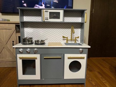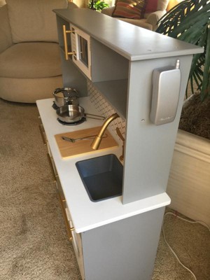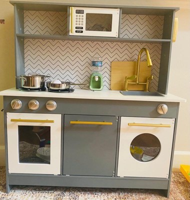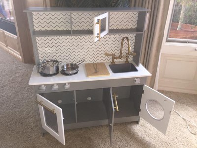 [This review was collected as part of a promotion.] We are extremely happy with our new Little Chef Berlin Modern Play Kitchen. We've had 2 other kitchen sets before this but this is by far and away the best looking kitchen set we've ever had. We're happy to have this in our play room and have received several compliments on how cute it is. It's a good quality set too with all the basics you need in a kids kitchen to keep them busy for hours (or minutes as kids attention spans go). Comes with a stove top, oven, some cabinets, a kitchen sink with very stylish gold farmhouse type faucet, microwave, phone, some pots/pans, utensils, and a cutting board. I've included some pictures so you can see what it looks like. I would have given 5 stars but a couple of the cabinet holes weren't drilled properly and the hardware didn't fit perfectly so I worry a little bit about how they'll hold up to the kiddos usage. Took about an hour to put together so plan accordingly. Helpful to have 2 people also for several of the steps. We'll see how it holds up long term but very happy with our initial experience and would recommend to you.