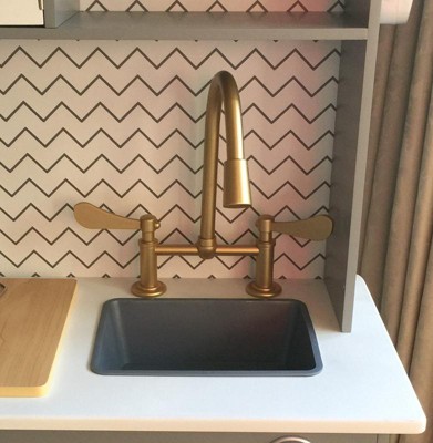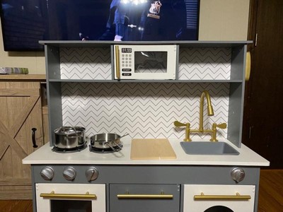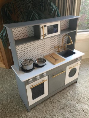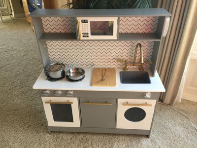 [This review was collected as part of a promotion.] This Little chef modern play Kitchen is adorable. It came in lots of pieces but, was pretty simple to put together. Only took about an hour to do. It isn’t as sturdy as say a little tykes kitchen, but boy is it cute and stylish. I loved the gold fixtures and the real looking little pots that came with it. The chevron back splash was really cute! This would be so cute in a child’s bedroom that has a more modern look. I highly recommend this kitchen play set.