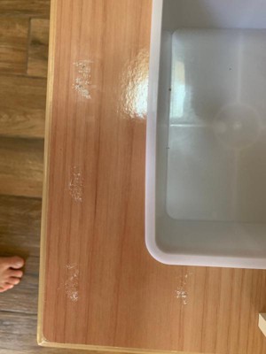 [This review was collected as part of a promotion.] We’ve had the tacky and bulky plastic play kitchens in the past and they were such an eye sore. This play kitchen is more pleasing to the eye and it blends in with the rest of our furniture (it sits in our dining room). It was easy for my husband to put together and I LOVE that’s in small in size. I was disappointed however about some scratches and blemishes that were on the sink area when it arrived. I added in the pics.