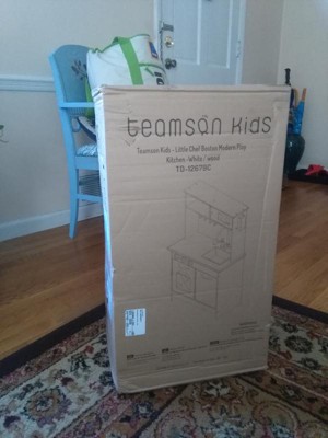 [This review was collected as part of a promotion.] The little chef Boston Modern play kitchen was a bit challenging to put together, it took me about two hours to put together but it was completely worth the look on my childrens face.it isa decent height for toddlers and does not take up much space at all. It helps with imagination and hours a Of fun. My kids love cooking, washing dishes, and talking on the phone.
