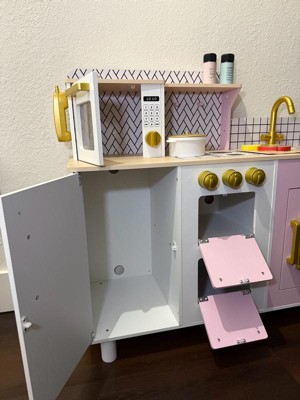 [This review was collected as part of a promotion.] This play kitchen set exceeded all of my expectations! The design is adorable with its soft pastel colors, realistic gold accents, and little details like the microwave keypad, oven knobs, and sink faucet. It looks stylish enough to fit right into our home, but still perfectly sized for little ones. My three-year-old daughter absolutely loves it! The moment we set it up, she was busy “cooking” meals, opening the oven, and pretending to wash dishes. The interactive features really spark her imagination, and it keeps her entertained for long stretches of time. It’s sturdy, well-made, and feels like it will hold up through years of play. Overall, this has been one of the best toys we’ve purchased—it encourages creativity, role play, and independent fun. Highly recommend for any toddler who loves pretend play!