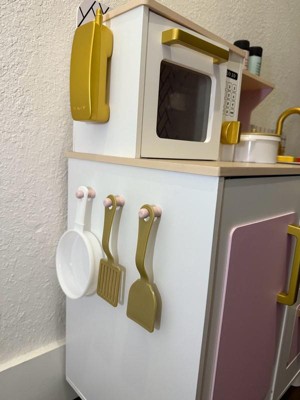 [This review was collected as part of a promotion.] The cutest play kitchen the pink and gold accents are very nice and the details that it has with the microwave and the two ovens is really cute. This is actually a pretty small kitchen and I thought my 24-year-olds would be able to share it, but it’s a little bit too small for them, but I do think it would be perfect for just one child. It comes with some accessories that I didn’t expect like some pretend food that you can cut And a phone as well.