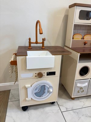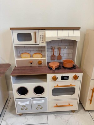 [This review was collected as part of a promotion.] The Teamson Kids Wooden Play Kitchen Set is really fun! It has a sink, laundry washer, two stoves, a microwave, an oven, a toaster, two garbage bins, and a fridge with an ice maker and a case of eggs. The kid spends hours pretending to cook, bake, and toast all kinds of food. Putting it together was a bit of a challenge. The set came with too many broken pieces. The wood is particle wood, so it’s not super sturdy and can break if you’re not careful. It took 6 hours to assemble because there are so many small pieces. Some pieces needed glue, and a few didn’t have the right holes for screws, so drilling was required. The instructions could be clearer, but if you pay attention, it all comes together. If every piece was perfect, it would probably take around five hours, but it’s still doable. I do wish it came with more accessories like milk, fruits, or veggies. Adding some extras will make playtime even more fun. Despite all the tedious assembly and broken pieces, the kid absolutely loves it and plays with it for hours every day. It’s a really fun set for little chefs, as long as you’re ready to spend some time putting it together!
