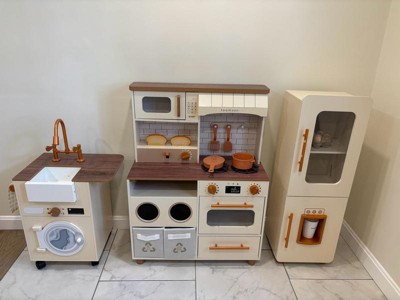 Create hours of imaginative play with this white wooden play kitchen set, designed for toddlers and kids who love to cook, clean, and create their own stories. With **3 modular pieces—a play fridge, sink/laundry combo, and stove/oven unit—**this set offers a flexible setup that fits any playroom layout.