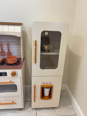- Packed with Realistic Features: From the 3D stove with turning knobs that make click sounds, to the pop-up toaster, microwave, and working ice maker that drops cubes—this wooden play kitchen feels just like the real thing.