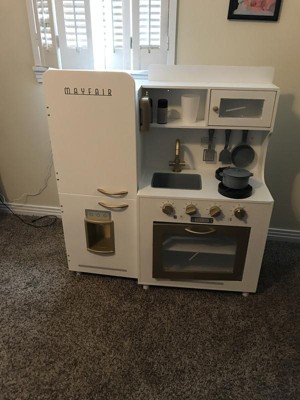 Little Chef Mayfair Play Kitchen has a retro style with modern conveniences. Features a refrigerator with icemaker, oven range, sink, and microwave. Multiple shelves, cabinets, and storage pegs make storing the included cookware accessories a breeze.