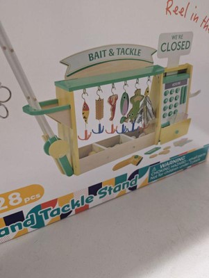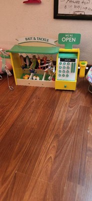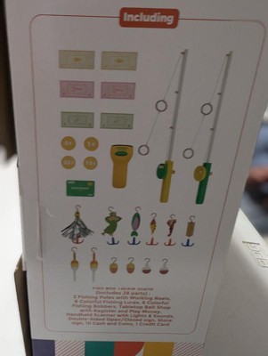 [This review was collected as part of a promotion.] Tabletop fish and tackle stand featuring a cash register with play money and two-sided Open/Closed sign. You will need to put this set together. This toy comes with a pair of fishing poles with lines that can be reeled back in. Six colorful fishing lures and six realistic fishing bobbers that dangle from the fishing poles. Each set features a yellow scanner with lights and sounds that operates on 2 AAA batteries, which are not included.