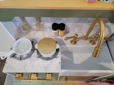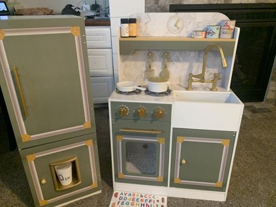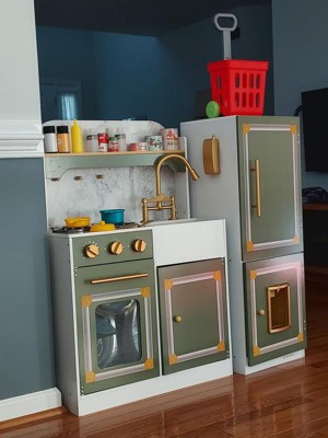 [This review was collected as part of a promotion.] This is the cutest kitchen set I have ever seen! It doesn't look cheap at all, in fact it looks luxurious, with the olive green color and the marble backsplash and the gold hardware. It is definitely something I don't mind having up in my house all the time!! I like the fact that the fridge can be separate from the sink and cupboards. The fact that the fridge dispenses ice, makes it super realistic and something that the kids love! The accessories that come with it are ones the kids use a lot of, and they can be stored very easily when not in use in the cupboard. The clicking knobs and moveable clock and phone makes things very interactive for the kids!! This was super easy to set up, and just as easy to take down if you need to (personally, I like it up all the time because of how it looks). This kitchen set kept the kids entertained for hours and had them making everyone food!! Such a quality set and I am glad I have it!!!