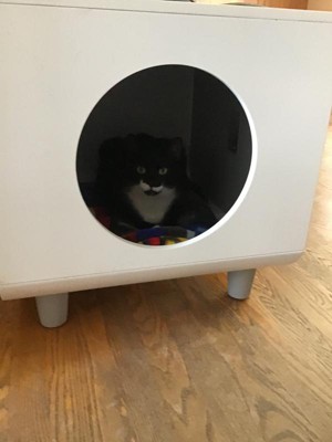 [This review was collected as part of a promotion.] I am very pleased with this Staart Dyad Mid Century Wooden Cat Litter Box Cabinet and Side Table, Alpine White. I absolutely love the contemporary design. I really like this cabinet/side table is so versatile. This piece of furniture can be used as a litter box or a pet bed while also I use as a side table/nightstand. There is also a large hole on the side of the litter box allows easy entry and exit for cats which is great. The assembly was super easy and the instructions were very simple. Overall this furniture piece was just the perfect size for me and it stands out and looks beautiful in my home. I highly recommend this.