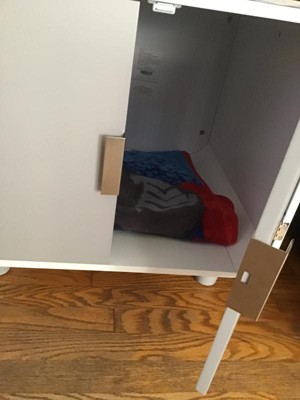 [This review was collected as part of a promotion.] Very easy to put together and install. I was kind of worried my cat's wouldn't want to go in and out it but they have not had a problem with it and they actually like it it gives them more privacy. It's a nice cabinet and great for a side table you can put anything on there you like or if you prefer to decorate around it then that works too.