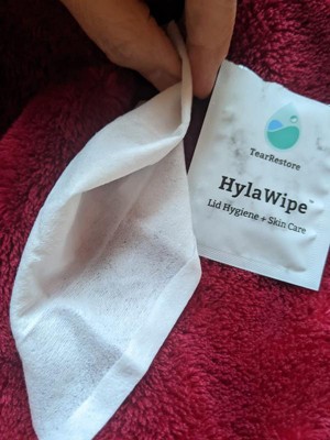 The one-of-a-kind TearRestore HylaWipe eyelid wipe combines clinically proven natural tea tree leaf oil with premium moisturizing compounds to effectively cleanse the eyelids, soothe irritation, and leave you with visibly healthy eyes. Developed with top eye care professionals and dermatologists, the HylaWipe eyelid wipe is effective for Blepharitis, Demodex Eye Mites, Rosacea, and Dry Eyes. This preservative free and hypoallergenic lid wipe utilizes a gentle concentration of natural tea tree leaf oil to effectively cleanse crusty eyelids without irritation. You can use these in combination with ocular medications to assist with fighting styes, conjunctivitis, pink eye, eye strain, dry eye, eye fatigue, itchy eyes, and crusty eyelids. Calming plant extracts soothe red, puffy, and irritated eyes by reducing inflammation which can promote longer comfort in contact lenses. HylaWipe eyelid wipes contain ultra-moisturizing Hyaluronic Acid to reduce swelling and redness while improving the appearance of fine lines & wrinkles.