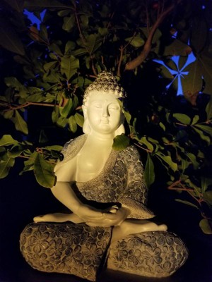 [This review was collected as part of a promotion.] I love my Buddha Garden Statue with Solar Spotlight. I placed it in my backyard by my pool and it lights up beautifully. It just brings a serene quality to the space. It was also super simple to set up; no complicated instructions at all.