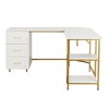 This L-shape computer desk will add a rustic, contemporary feel to your room while creating an efficient workspace environment. It unifies a heavy-duty steel frame with gold accents and appealing rich, engineered white color wood tabletop that offers spacious space meeting your work needs while you focus on your projects. This stylish and functional L-shaped desk design includes two adjustable open shelves and three side white storage drawers to conceal office accessories and documents. This desk's functionality and versatility brings style and organizational appeal to your workspace