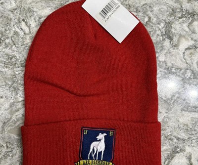 Root for your favorite football team with this Ted Lasso cuff beanie. The beanie comes in red and features embroidered front art of the AFC Richmond Greyhound mascot on a blue shield while a woven label on the back displays the series logo. The beanie is made with high-quality acrylic yarn and comes with a tall cuff shape to help you stay warm and cozy. Celebrate your favorite TV series with this Ted Lasso cuff beanie.