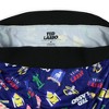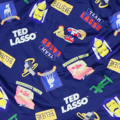 • Ted Lasso Print: Features a detailed all-over design with graphics inspired by the Ted Lasso series, including the “Believe” sign, AFC Richmond insignia, whistle, and a British-style tea set. These vivid elements celebrate fan-favorite references