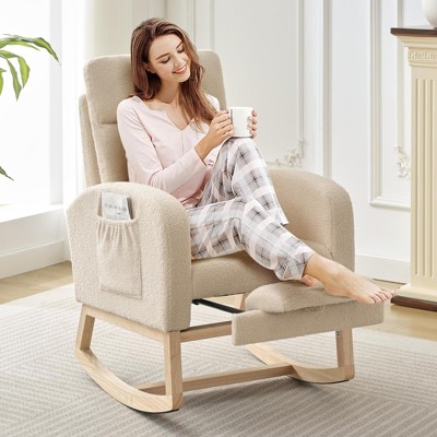 Gentle 15¡ã Rocking Motion:Offers a comfortable forward and backward rocking motion within a 15¡ã arc for relaxation.Premium Material Construction:Crafted from Teddy fabric upholstery, foam filling, a sturdy wooden frame, and a solid wood base for durability