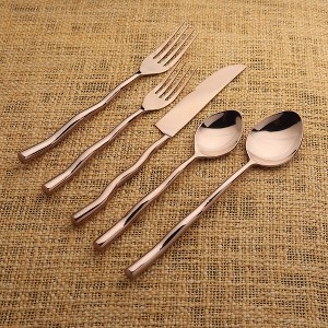 Tedpole PVD flatware features a whimsical design that enhances modern dining experiences. This artisan-crafted flatware has wavy handles, which contribute to a unique and playful aesthetic. Made from stainless steel with a beautiful PVD finish, the lively contours of the handles create a captivating play of light and add a fresh, artistic touch to your dining table.