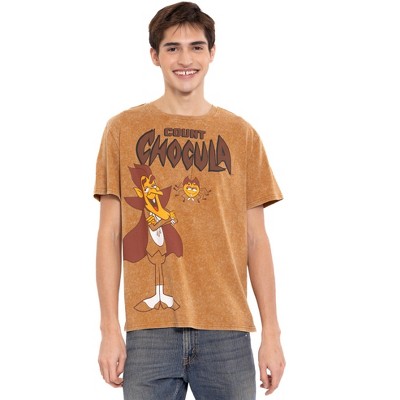 I Want To Eat Your Cereal! Introduced in the 1970s along with Boo Berry and Fruit Brute - Count Alfred Chocula isn't your average vampire. His prey of choice is only boxes of delicious chocolatey cereal! Our team paid tribute to this sweet-toothed vampire with his very own retro graphic tee featuring the classic Count Chocula cereal box logo. To complete the vintage look and feel of this Count Chocula shirt - we've distressed the graphic and printed it on a soft and comfortable, short sleeve tee. Perfect for celebrating your favorite cereal any day of the year! This cartoon vampire shirt is available in Heather Brown (50% Cotton/50% Polyester) or Charcoal Heather (52% Cotton/48% Polyester) colors. Men's Sizes S, M, L, XL, XXL, and 3XL.