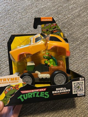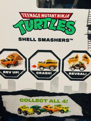 Smash it up, Turtle style! With the Shell Smashers, your favorite Teenage Mutant Ninja Turtle, Michelangelo, is ready to race and crash. Simply hold the vehicle, push forward to rev the engine, race towards a surface, and watch as the car smashes into action. When the bumper hits the surface, the top shell pops off to reveal a radical new style underneath! Plus, the engine lights up! Collect all 4 characters! Appropriate for ages 5 and up.