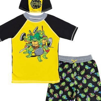 • Officially licensed Teenage Mutant Ninja Turtles TMNT little boys 3 piece mix n’ match bathing suit set: cool and stylish short sleeve swim shirt top, swimming shorts bottoms, and hat