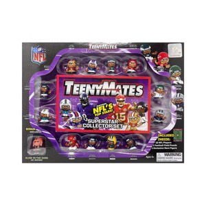 All the action is in the palm of your hand! Now you can own 1-inch tall figures of your favorite NFL Players with this 13-figure TeenyMates Collector Set! Each set includes 12 NFL Player Figures, 1 Limited Edition Glow In The Dark NFL Referee, and 5' x 7' 35-Piece Football Field Puzzle!