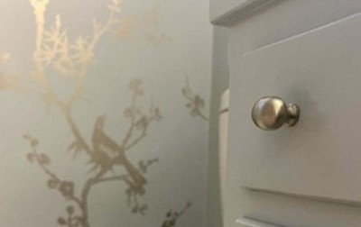 I was looking for some wallpaper for one wall to compliment the 1950s tile I couldn't replace. This blue matched perfectly. Then I took the sample to the paint store and had them match the color for the rest of the bathroom and the built-in sink vanity. I watched all the videos, did all the prep. I've never hung wallpaper before. It's not as easy Read more about I was looking for some wallpaper foras the videos make it look but it is certainly easier than unpasted wallpaper. Did I do a perfect job? No. Are there a few bubbles that won't go away and I don't understand why? Yes. But do I love it? Yes. When the light hits the silver metallic design the whole (tiny) bathroom pops. It definitely makes my home look classier than it did before the wallpaper. I wish I could post a picture, especially with the brushed nickel egg-shaped cabinet knobs that I couldn't resist because of the bird theme.