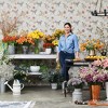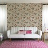 Pink and yellow botanicals surround charming songbirds perched on stylized branches. Our greige Birds peel and stick wallpaper from The Novogratz features a harmonious blend of gray and beige with colorful accents, bringing bohemian energy to any bathroom, bedroom, or beyond.