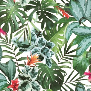 Revitalize your home with the vibrant beauty of Tempaper's Rainforest Foliage peel and stick wallpaper. Showcasing photorealistic palm leaves in rich green tones, complemented by vibrant red, orange, and pink accents, this tropical wallpaper infuses any space with a true jungle ambiance. Ideal for bathrooms, bedrooms, and children’s rooms, its self-adhesive, removable design makes it a renter-friendly, easy way to refresh your décor. Simple to apply and reposition, this nature-inspired wallpaper transforms your space with ease and style.