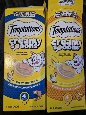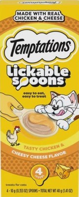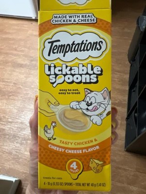 - 4-Pack: Contains four (4) 10-gram spoons of Temptations Lickable Spoons Tasty Chicken and Cheesy Cheese Flavor Adult Wet Cat Treat