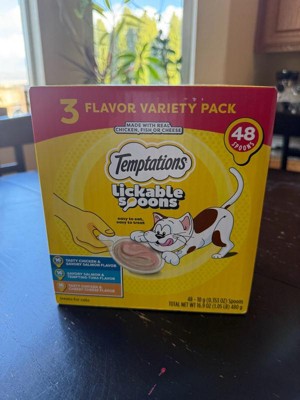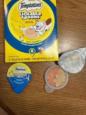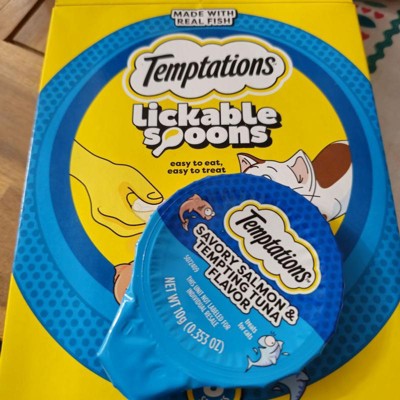- 24-Pack: Contains eight (8) 10-gram spoons of TEMPTATIONS Lickable Spoons Tasty Chicken and Cheesy Cheese Flavor, eight (8) Savory Salmon and Tempting Tuna Flavor, and eight (8) Tasty Chicken and Savory Salmon Flavor Adult Wet Cat Treats