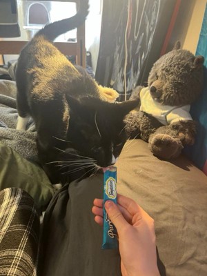 This is the only brand of puree treats that all of my cats will eat. They love the flavors except one of my cats refuses to eat the chicken flavor. The sticks are easy to feed during treat time although sometimes the consistency is watery and spills on the floor.