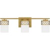 Add a touch of modern luxury to your bathroom with Tenley. The opal etched glass shades are wrapped in a delicate geometric pattern, inspired by the cool curving lines of Moroccan architecture. An aged brass finish adds sophistication and shine, making Tenley bath lights the perfect statement over any vanity.