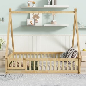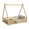 This twin bed has a unique tent design—blends natural charm with minimalism to boost bedroom appeal. Its tent outline adds playful nature vibes, sparks imagination, and creates a cozy private sleep nook. Functionally, it focuses on safety, convenience, comfort. Surrounding guardrails boost play fun and eliminate safety worries (great for kids). A dedicated entrance enables easy in/out; low-to-ground platform enhances safety and accessibility. Simple assembly: one package with manual + hardware, even non-handy users finish fast. Materials-wise, it’s high-quality rubber wood—sturdy, long-lasting. All components are firmly secured for solid stability (no wobbling/shifting). To sum up, this bed combines style, functionality, durability. Nature design adds whimsy, fits all interiors; practical features meet daily needs. Rubber wood ensures longevity—perfect for kids’ safe beds, small bedrooms, or nature-themed decor.