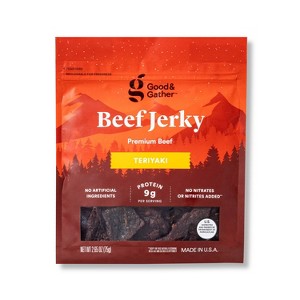 Teriyaki Beef Jerky from Good & Gather™ is a great way to enjoy a savory snack with a hint of sweetness. Made from USDA certified beef in the United States, this beef jerky has a delicious teriyaki flavor with no artificial ingredients, as well as no nitrates or nitrites added*. The teriyaki jerky has 10 grams of protein per serving and is 98 percent fat free. It's a snack you'll be glad to reach for during hikes, after workouts or when a mid-afternoon snack craving hits. The 2.65-ounce pack of jerky is a perfect size for throwing in your hiking backpack or gym bag, or keeping in your office desk drawer for easy access.*except for those naturally occuring in sea salt and cultured celery powder.