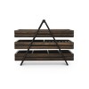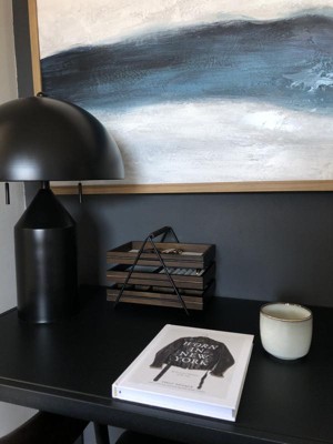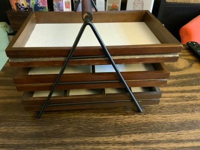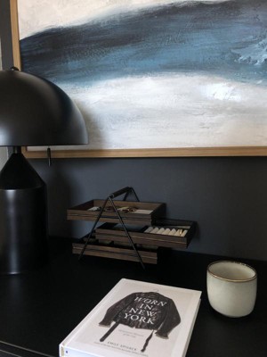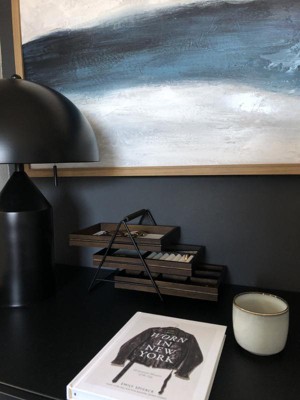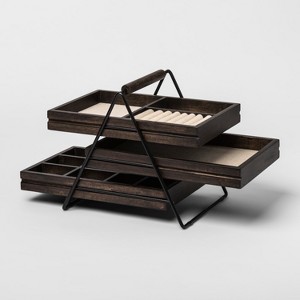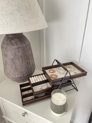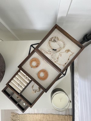 - ELEGANT AND MODERN JEWELRY TRAY: Terrace has three sliding linen-lined wood jewelry trays made of Paulownia wood in a walnut finish, a black metal frame, and wooden handle