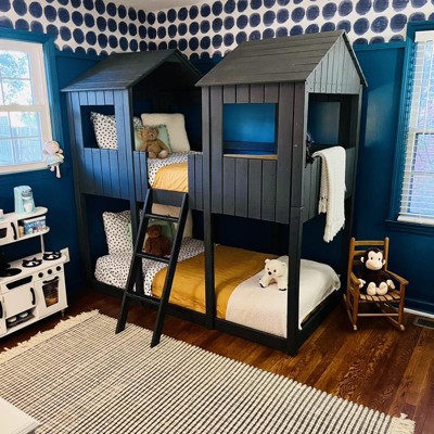 A: The wallpaper features a playful pattern of navy blue polka dots on a beige backdrop.