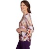 This textured floral top features a delicate floral design with a flattering crew neckline, enhanced by double-sided ruching for a slimming effect. The three-quarter sleeves and detailed knotted crewneck add a touch of sophistication.