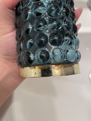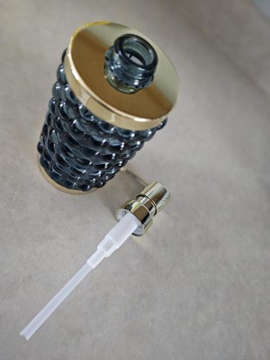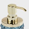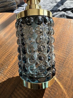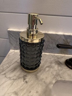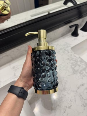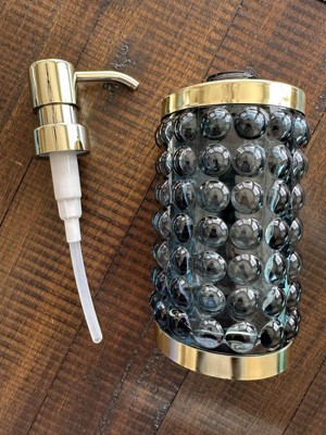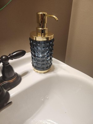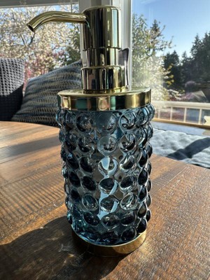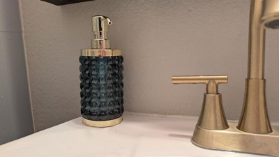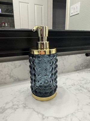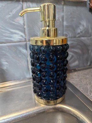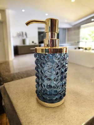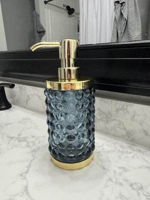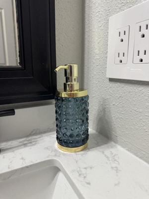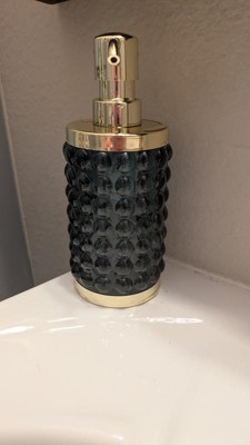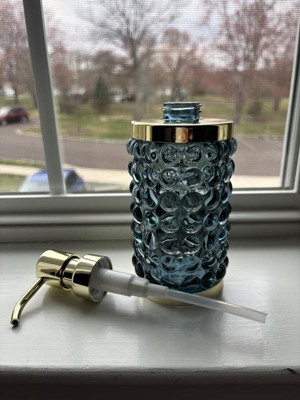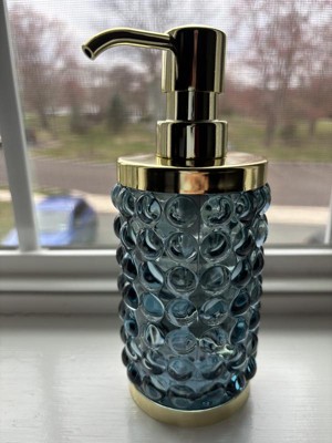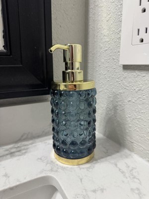 Add a luxurious and functional touch to your bathroom with this Textured Glass Soap Pump from Threshold™. Made of glass, this soap pump features a gold-tone base and dispenser for elegant charm, while the bubble-like raised design adds an aquatic touch. Compatible with lotions and liquid soaps, this 9.8-fluid-ounce soap pump in blue is a must-have addition to your bathroom.