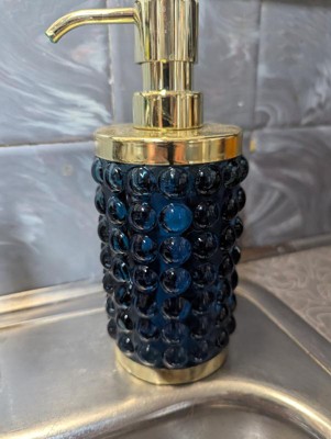 This glas soap dispenser is so pretty. The blueish bubble glass and gold accents is so chic and stylish. Nice, thick and solid glass. Well made and a beautiful compliment to any sink area, kitchen or bathroom. Far exceeded my expectations and a good value as well. Make your space look luxe on a budget. For sure grab this.