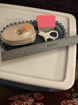 I am a complete sucker for pretty glassware, and this oval tray does not disappoint. At the moment, I’m using it on my writing desk to keep my three cats’ grooming tools tidy and accessible. The approximately 9” X 4” transparent dark blue glass tray conveniently corrals their comb, nail clippers, and brush. On the bottom are 4 nonskid bumpers. The top is rimmed all around with little marbles. It’s utterly smooth and easy to clean. This could also serve as an elegant spoon rest at the cooktop or of course as a soap dish. There are endless options.