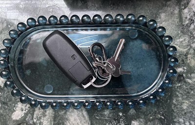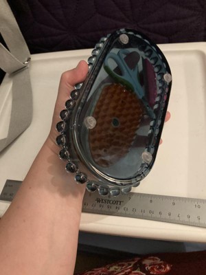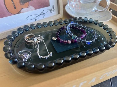 This blue textured glass tray is absolutely gorgeous! The shade of blue is rich and elegant, and the textured glass catches the light in such a lovely way—it adds a perfect pop of color and style to my nightstand. It has a nice, substantial weight to it, and the little rubber feet on the bottom keep it stable and protect the surface underneath. I use it to hold my jewelry while I sleep, and it feels both practical and decorative—like a little luxury in my daily routine. The only minor downside was the barcode sticker on the bottom. I understand it’s necessary, but it was a bit of a pain to remove. Still, totally worth the effort for how beautiful this piece is! Highly recommend if you’re looking for something functional and stylish.