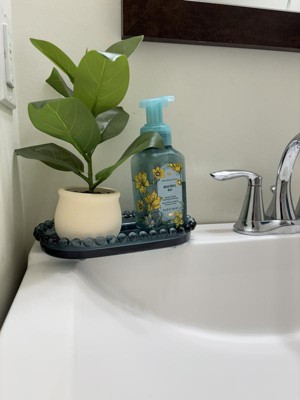 This is a beautiful glass tray for the bathroom sink area. The blue color is just gorgeous. It is solidly built and won't move around a wet countertop thanks to the rubber grips on the bottom. It's a bigger size so it can hold a lot of products and keep the sink area from getting cluttered. It looks much more elegant than silicone or plastic trays I have used in the past.