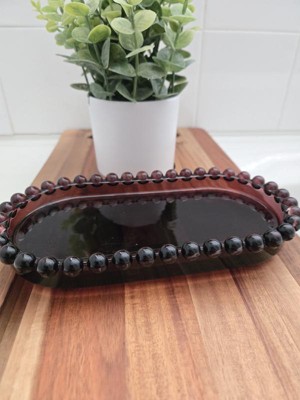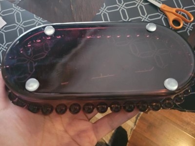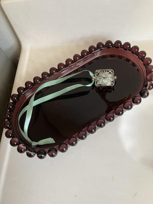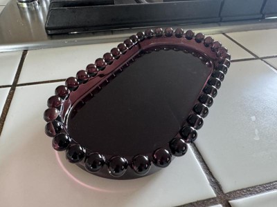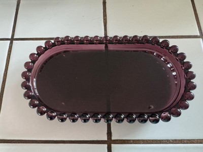 This is a well-made glass tray. Heavy, thick, and uniquely designed. I love the beaded look around the oblong shape. It adds classy characteristics. Rubber feet keep this from shifting on all surfaces, making it ideal for the bathroom or bedroom. I found myself using it to collect my rings or other delicate jewelry. The mulberry color stands out, warming up the space with just little effort.