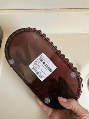 This glass textured dish is both classy and functional. I love the deep plum color as it really pops on my white quartz countertops. It is the perfect size to put a soap dispenser and something else. I use it at my kitchen sink and it adds a touch of class. I love the textured "bubbles" around the edge, as it gives the dish more texture. There are clear plastic bumpers on the bottom of the tray to keep it from scratching. Overall, this is high quality and a great way to add color and class to a room.