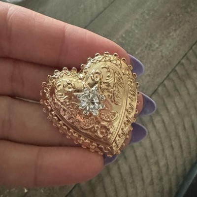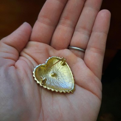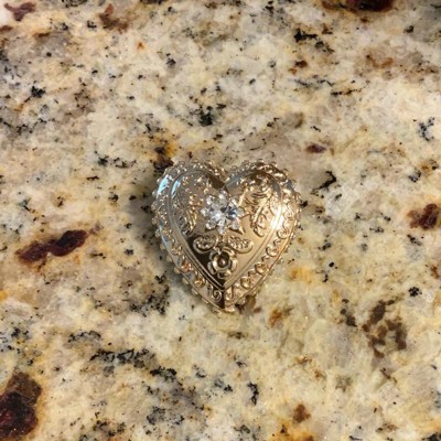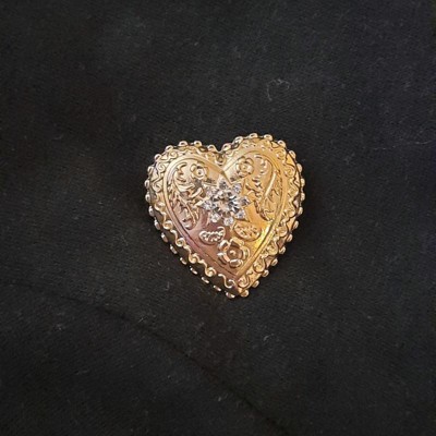 [This review was collected as part of a promotion.] This textured heart pin is large enough to stand out against any T-shirt or hat or item(S) that you might want to pin it on. This heart, Imitates yellow gold with a round center stone and smaller round stones around the outside of the center stone. This has a typical pin clasp. The pin itself is very lightweight. This pin measures about an inch wide by an inch long. I received an incentive to write this review.