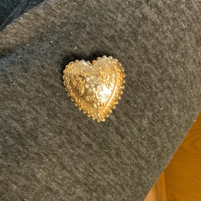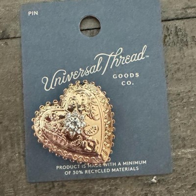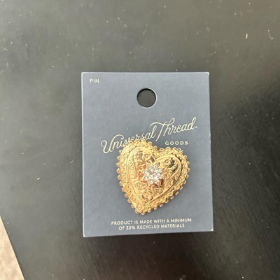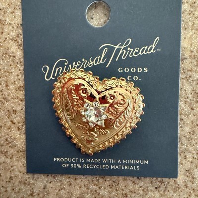 Take your going-out looks up a notch with this Textured Heart Pin from Universal Thread™. Designed in a gold hue for a lustrous finish, this pin showcases a heart shape with stylish border and stones inside the star for a lovely look. The heart pin is made from nickel-free metal to suit most skin types, while the safety pin closure makes it easy to attach to a dress, blouse or bag for an instant style upgrade.