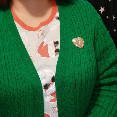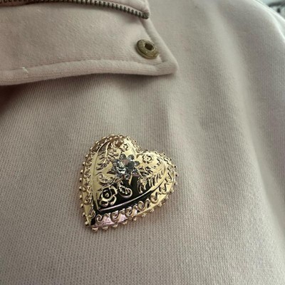 [This review was collected as part of a promotion.] I like to dress up my cardigans that I wear to work with pins sometimes so I bought this gold heart shaped pin. It is not flat, it's raised up and textured on the front with designs bordering around the heart and some leaves and flowers in the middle. Directly in the center is a round crystal like stone. It looks to me like it will fall off easily. I think the cheap looking stone downgrades the quality. Overall it is pretty thoough. Not the best quality but for the price it is ok. It was easy to fasten. It looked nice on my sweater.